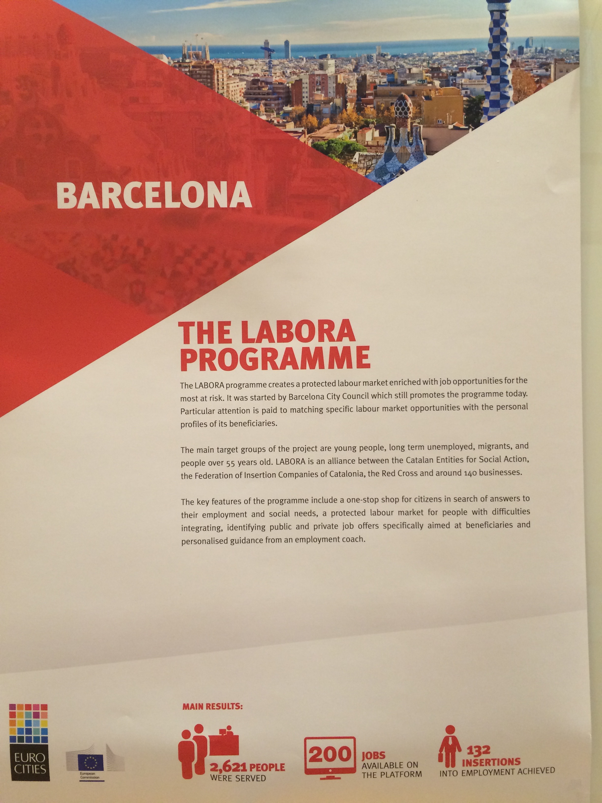 Durant la reunió semestral del 20 i 21 d’octubre de l’aliança de ciutats europees la nova Comissió Europea ha presentat les seves prioritats respecte de la inclusio social i l’ocupació. Les ciutats participats han intercanviat informació sobre projecte d’eficàcia provada. Barcelona ha donat a conèixer el Projecte LABORA. Es tracta d’un mercat laboral protegit adreçat a les persones i els col.lectius amb més dificultats per a inserir-se professionalment, com ara els aturats de lara durada, de més edat, amb discapacitat o pertanyents a col.lectius marginats socialment. El projecte està gestionat per les entitats socials i l’Ajuntament.